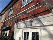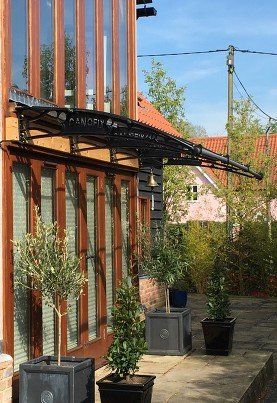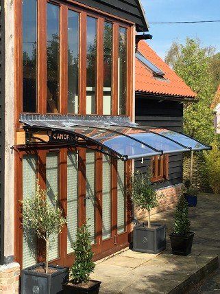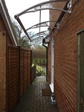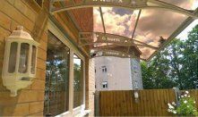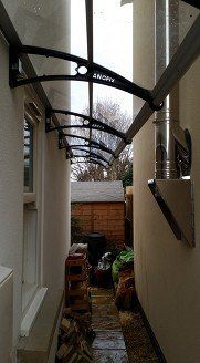 Each canopy consists of polycarbonate brackets, available in either light grey or black, with 2mm thick clear polycarbonate glazing and aluminium fixing pipes.
